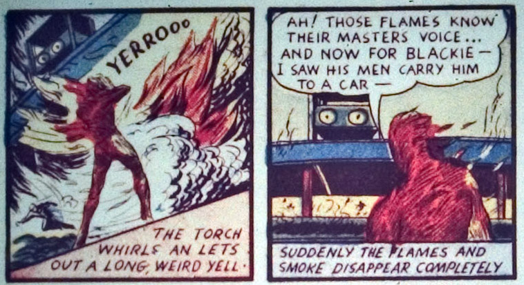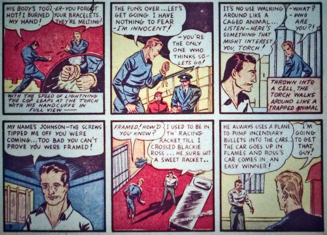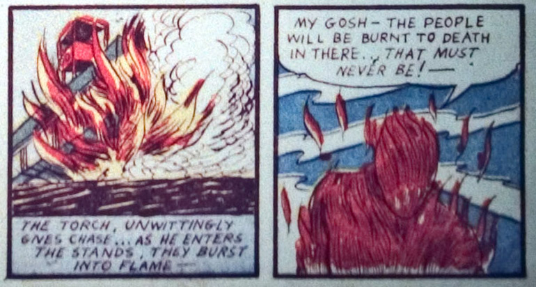 After complementing the artist, Carl Burgos, for understanding the way asbestos works, he writes an ending that misuses the substance. Oh well.