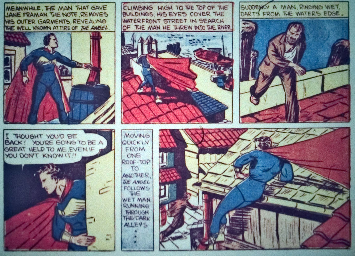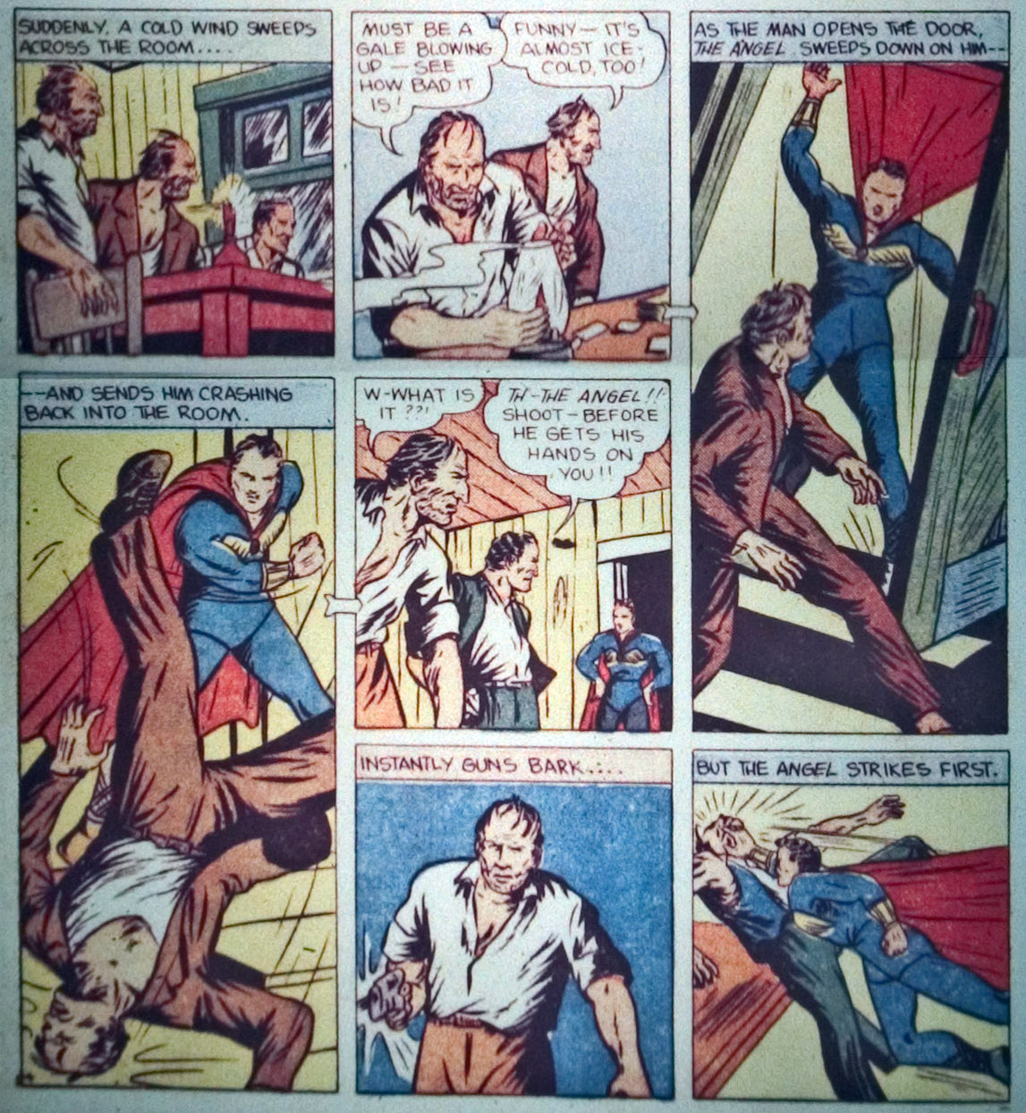 The cover by Charles J Mazoujian features the Angel, and illustrates the text story within, not the comic strip. Curiously, Mazoujian neglects to include the Angel’s trademark moustach. On the other hand, the Angel in the text story bears little resemblance to the Angel in the comic, so perhaps e are talking about two different, yet very similar characters?
