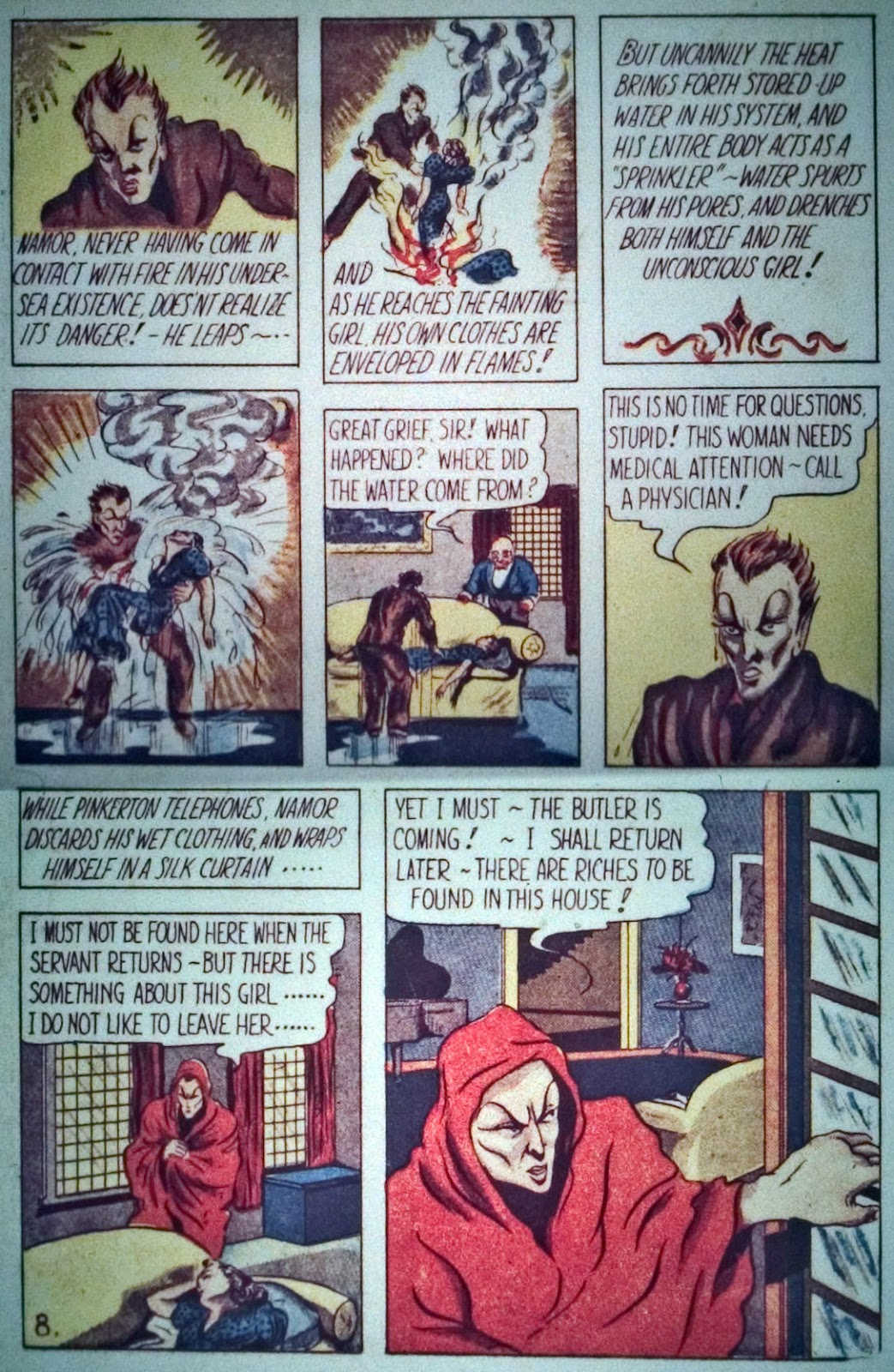 The Sub-Mariner story is the stand out in this issue, it’s chaos and terror and anarchy incarnate. The Sub-Mariner wants to destroy the world of white men, but he also lacks basic knowledge about the world. He kidnaps the poor woman without realizing that she will drown in Namor’s world. Things happen for almost no reason, like the woman suddenly catching on fire when Namor enters the room. The art is amazing, Everett outdoes himself with this issue, using that wonderful wash technique that will eventually go away as the deadlines begin to crunch.