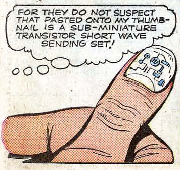 Igor is revealed to be a “Red Spy” and imprisoned. He has a “sub-miniature transistor short wave sending set” pasted onto his thumb.