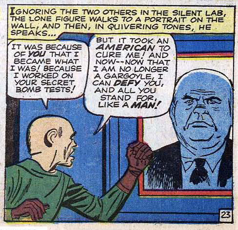 We learn that the Gargoyle is another victim of radiation poisoning, and when Banner offers him a chance to be cured, the Gargoyle takes it. Cured, the Gargoyle helps Banner and Rick Jones escape back to America, and then blows up his lab, striking back on the country that turned him into a monster.