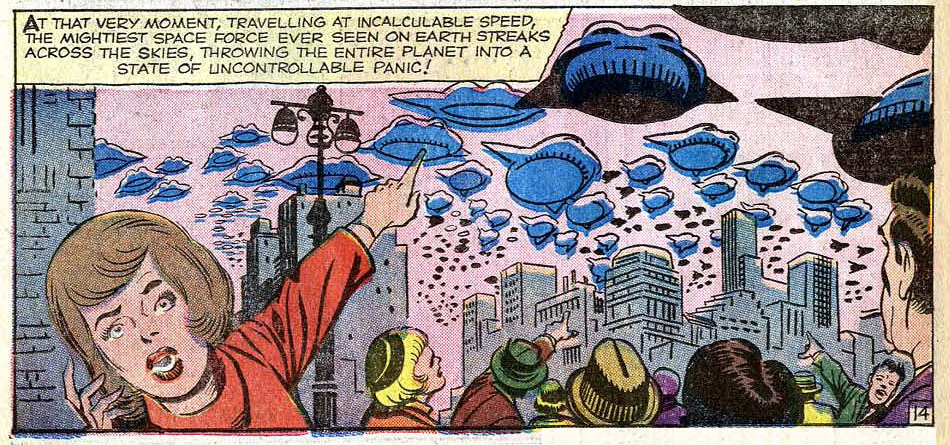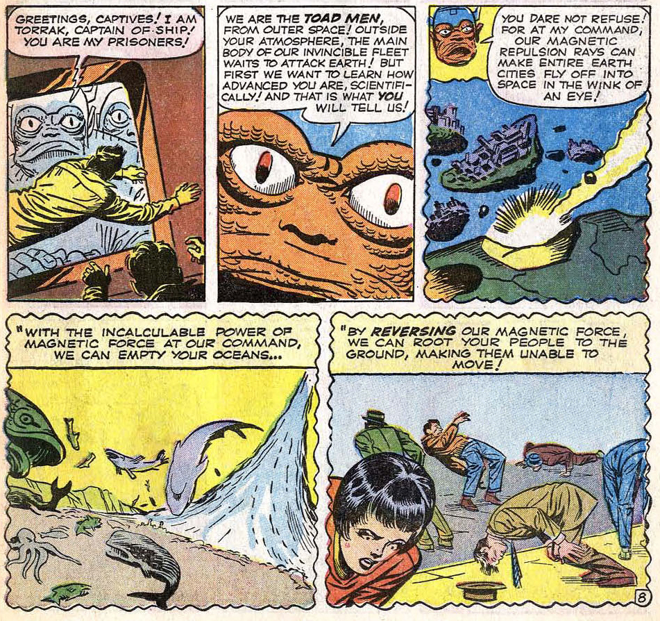 From a continuity perspective, this comic presents an interesting dilemma. When the Toad Men attack the planet Earth, their spaceships hover in the air for all to see, worldwide. Yet, if the Marvel Universe is one large consistent whole, why did the Fantastic Four not get involved? Why, in the continuity of the FF, does the invasion of the Toad men not even rate a mention?