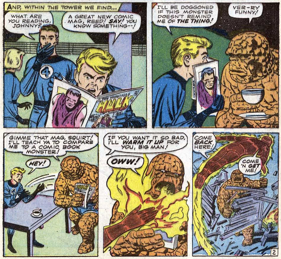 My feeling is that Stan Lee originally thought to keep the Fantastic Four and Incredible Hulk continuities separate. That’s why Johnny Storm is reading the Hulk comic in Fantastic Four 005 (featuring a purple, not green Hulk) and why the FF have no knowledge of the Toad Man invasion in their book. It’s only after fans ask for a meet-up between the characters and the Hulk comic is canceled after issue six that the merging the continuities occurs.