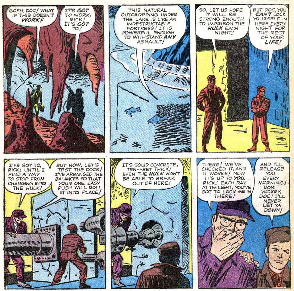 Meanwhile, Banner and Rick Jones have discovered a cave to be used as a prison to hold the Hulk in each night.
