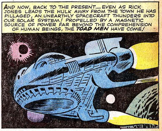 The early Hulk is not a hero at all. His first thought is not to save the Earth from the Toad men, but to use the Toad men technology to destroy the Earth himself. It’s the brilliance of Banner that defeats the Toad Men, not the strength of the Hulk. In fact, the Hulk is more interested in settling scores with General Ross (by going after Betty Ross) than in dealing with the Toad Men at all, who are dealt with in the last few pages.