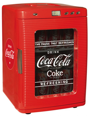 This personal fridge is the perfect accessory for the Coke ® lover in your life! This thermoelectric mini fridge can hold a whopping twenty-eight cans of Coca-Cola ® and keeps soda at a cool 35 degrees below ambient temperature. Transparent front window means you’ll always know how much Coke ® you have on hand.