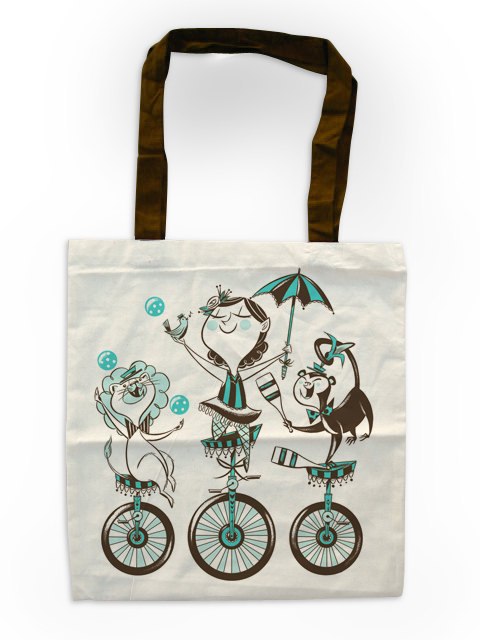 From Stephanie Buscema! These totes are a natural colored cotton with dark chocolate brown handles. My circus design is silkscreened with two colors, a dark chocolate brown and a bright robin egg blue. A nice, light, well-made tote!
