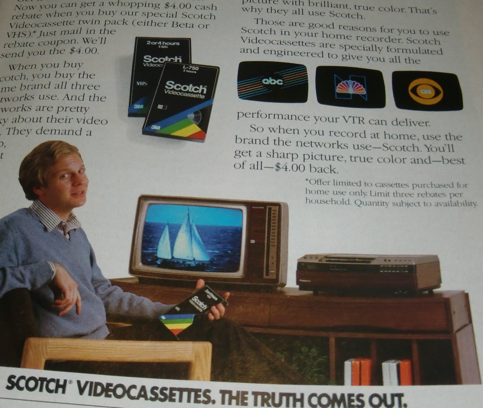 On my trip home this past weekend, I did end up throwing away a handful of newspapers and magazines collecting dust for no apparent reason, but not before flipping through them for some I Love the 80s action. I love this ad for the “quality” difference of Scotch VHS tapes. Did anyone ever believe that Brand A was better than Brand B for taping your favorite shows on VHS (not to mention EP mode)?