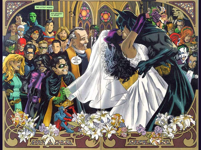 The wedding party would be total Justice League of America, with each side in paired couples: Superman and Lois Lane, Wonder Woman and Steve Trevor, The Flash and Iris Allen, Green Lantern and Carol Ferris. Carol’s dress would have a hint of Star Sapphire, of course. Add a Robin ring bearer and Batgirl flower girl, and we’re rolling.