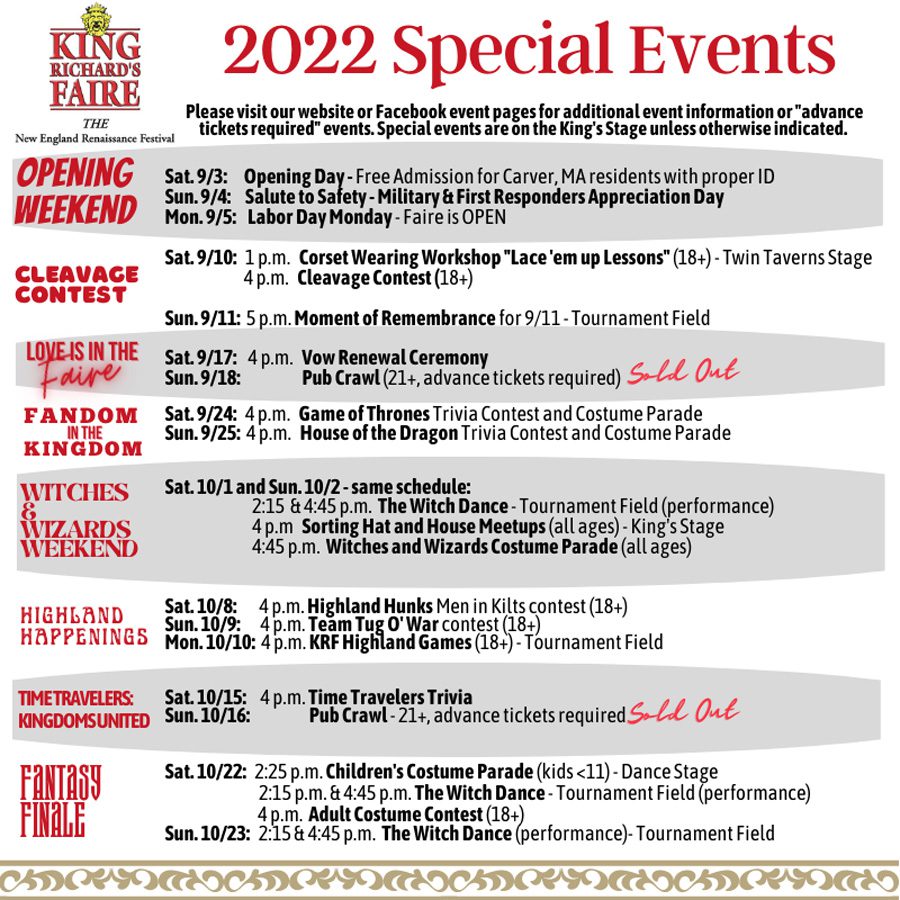 Visit kingrichardsfaire.net for a site map, event schedules, and ticket sales. When purchasing tickets online, print out tickets or download on your mobile device.