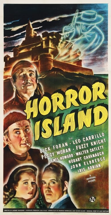 Though the house (or castle) gets little respect from the screenplay, it looks terrific on its little island. Our characters take a boat ride to the island for a treasure hunt, but – wouldn’t you know it – a sinister “phantom” (who looks like The Shadow) is lurking in wait. The plot and dialogue are surprisingly nimble for a film coming this late in the subgenre.