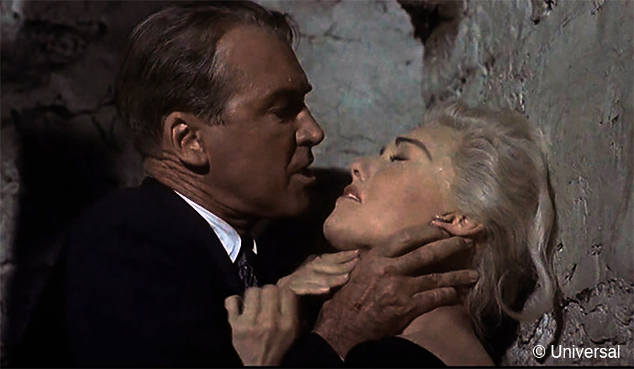 JAWS and Vertigo trade foremost in totalizing fear: the fear of what’s lurking in the water and of falling to one’s death. Both films feature professional police officers played by resolute everyman actors who have an encounter with death (Brody upon finding the corpse of the swimmer and Ferguson hanging from the building in the opening chase) that unlocks a primal trauma. This primal trauma causes them to become distanced, marked out, other-ized from their normal lives and communities as they deal with the reality of death in a way that most people are not comfortable with.