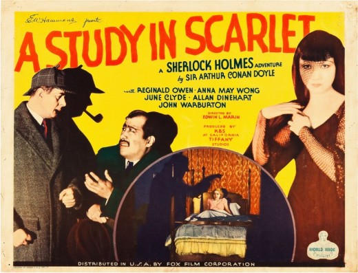 An American film, SHERLOCK HOLMES, followed in 1932, this one starring Clive Brook as Holmes and silent screen character actor Ernest Torrence as his arch-nemesis, Moriarty. Another Hollywood film, A STUDY IN SCARLET, was adapted by and starred Reginald Owen, and manages to achieve a good deal of atmosphere despite being produced on a low budget by a Poverty Row studio.