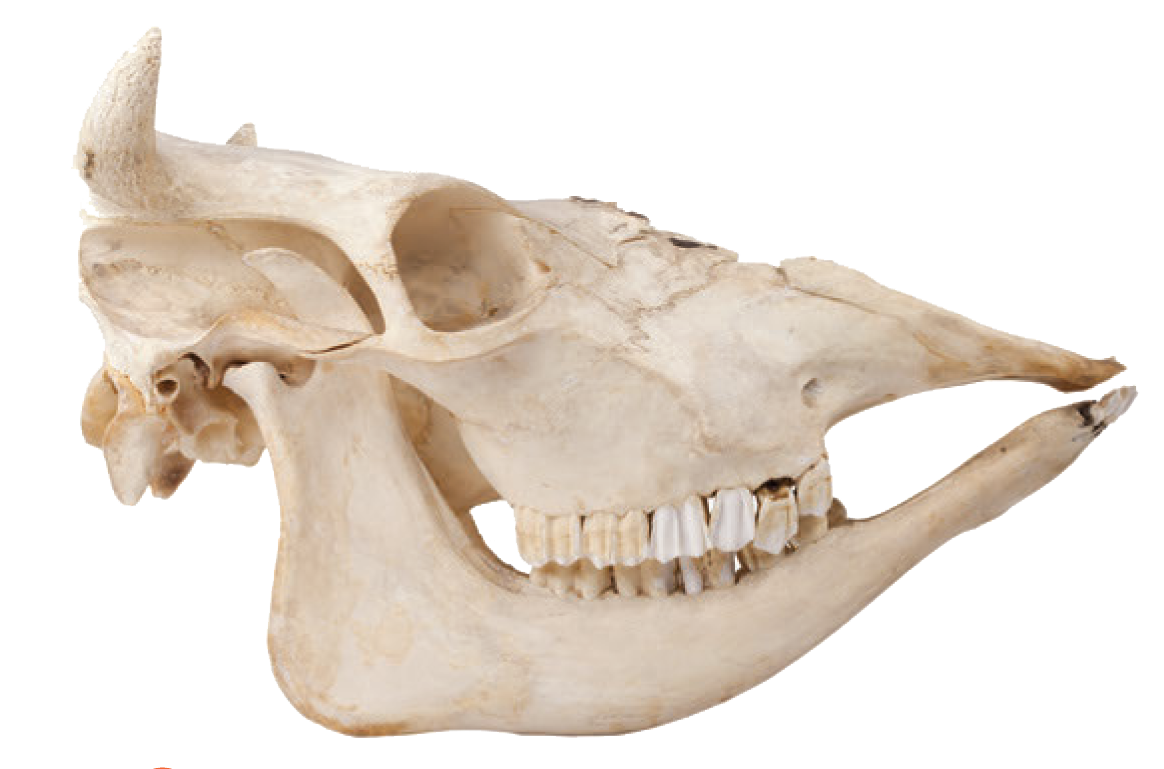 Goat skulls are a common item for a collection because they are fairly easy to find. Goats can be found in the wild or on farms. Many of them have two long, curved horns protruding from the top of their skulls. The dental formula is . If you find the skull without the lower jaw, there will be no teeth at all in front, only the flattened premolars and molars in back. That’s because a goat mostly eats plants.