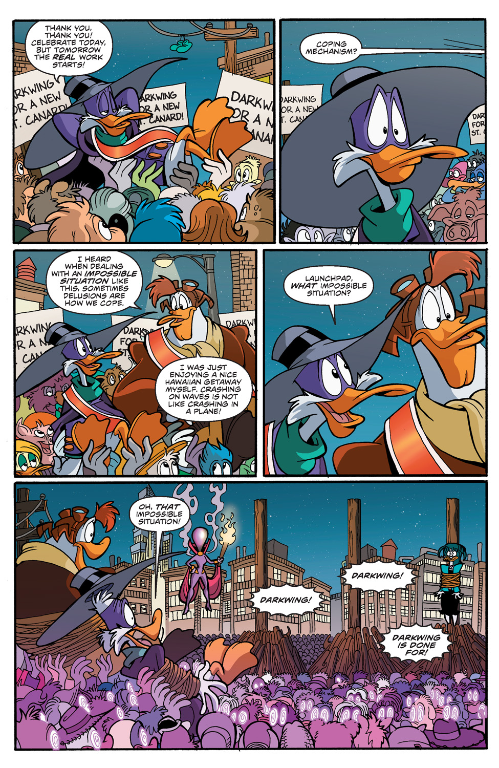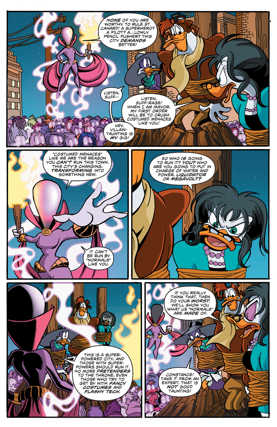 The unseen hand behind Darkwing and Launchpad’s political peril has been revealed and the powerful pundit won’t rest until all of St. Canard is conquered. Can the dangerous duo put aside their squabbling and put a stop to the villain’s deadly, debauched democracy? Find out as this arc-ending issue dares to get dangerous and fan-favorite writer Ian Brill and superstar artist James Silvani bring you another fantastic issue of DARKWING DUCK!