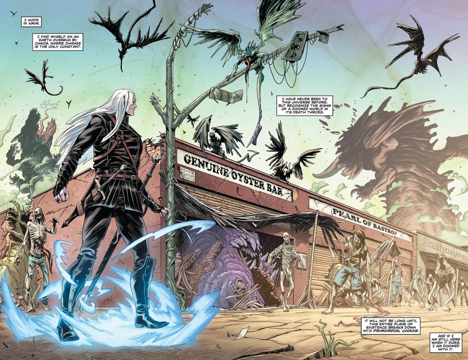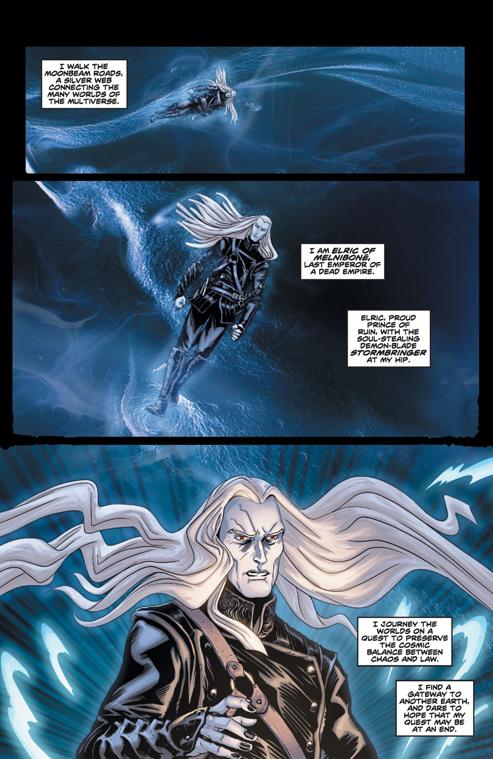 For 40 years comic fandom has thrilled to the exploits of Elric since his introduction in Marvel Comics’ Conan the Barbarian in the early 1970s. Neil Gaiman called Elric’s creator Michael Moorcock “my model for what a writer was” while Warren Ellis said he is one of the “eight core sites in my creative genome.” Now the godfather of the Multiverse teams up with hot New York Times bestseller Chris Roberson (SUPERMAN, iZOMBIE, STAN LEE’S STARBORN) for an ongoing series that sees a crisis break out across multiple worlds with Moorcock’s other two most famous fantasy franchise characters, Corum of the Scarlet Robe and Dorian Hawkmoon! The workings of Fate are being tampered across the Multiverse, upsetting the Cosmic Balance. Elric is on a quest to restore The Balance and save the Multiverse from ruin! Elric, Corum, and Hawkmoon are forced into action far and wide, but will they fight on the side of Law…or Chaos?