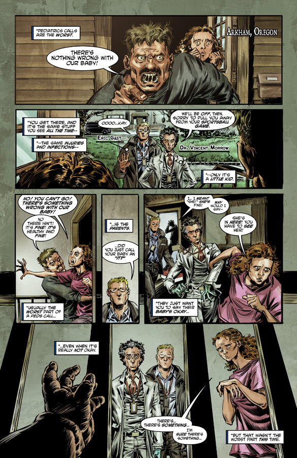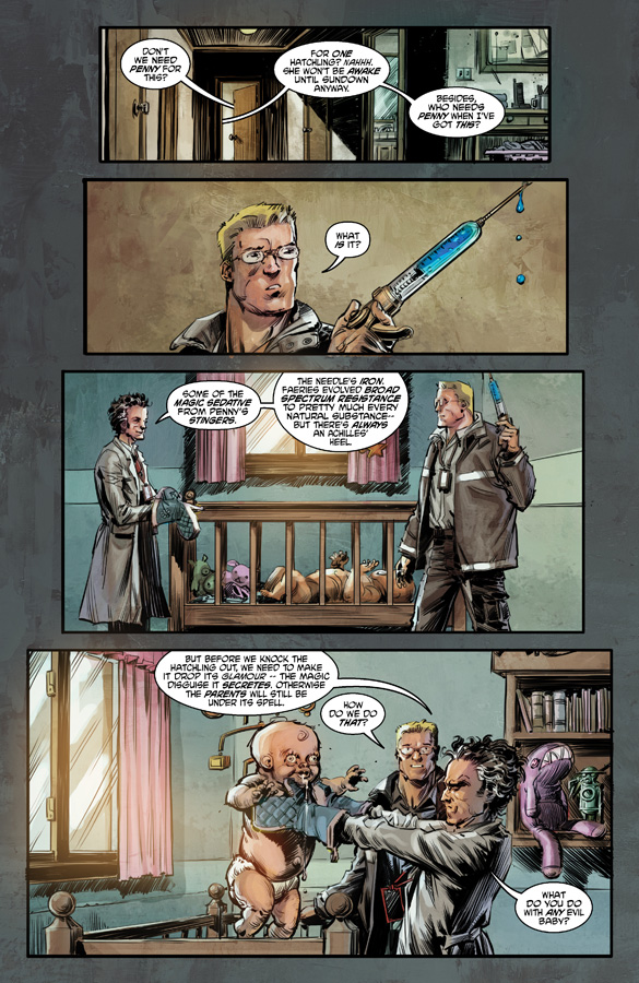 Is your baby really your baby — or is it a camouflaged monster that’s feeding on you while you sleep? An infestation of Cuckoo Faeries is spreading through the nurseries of Arkham, Oregon, and it’s up to Dr. Vincent Morrow, the Witch Doctor, to stop it! So why doesn’t he want to bother? Plus: Shark cage diving with sea monsters!