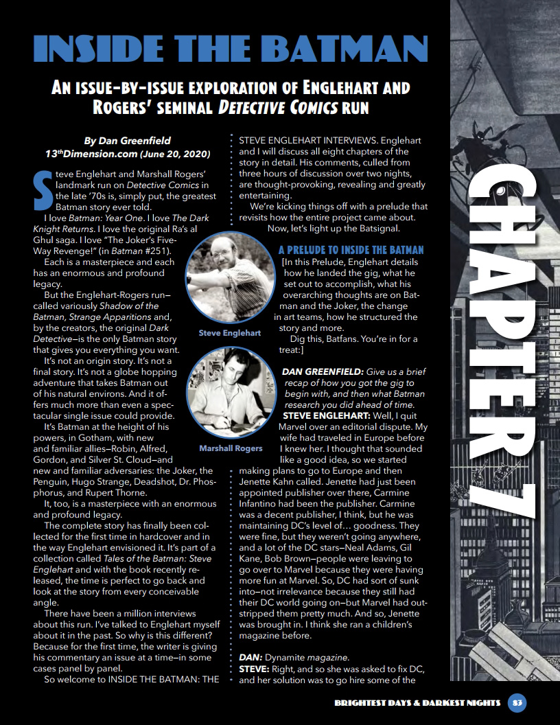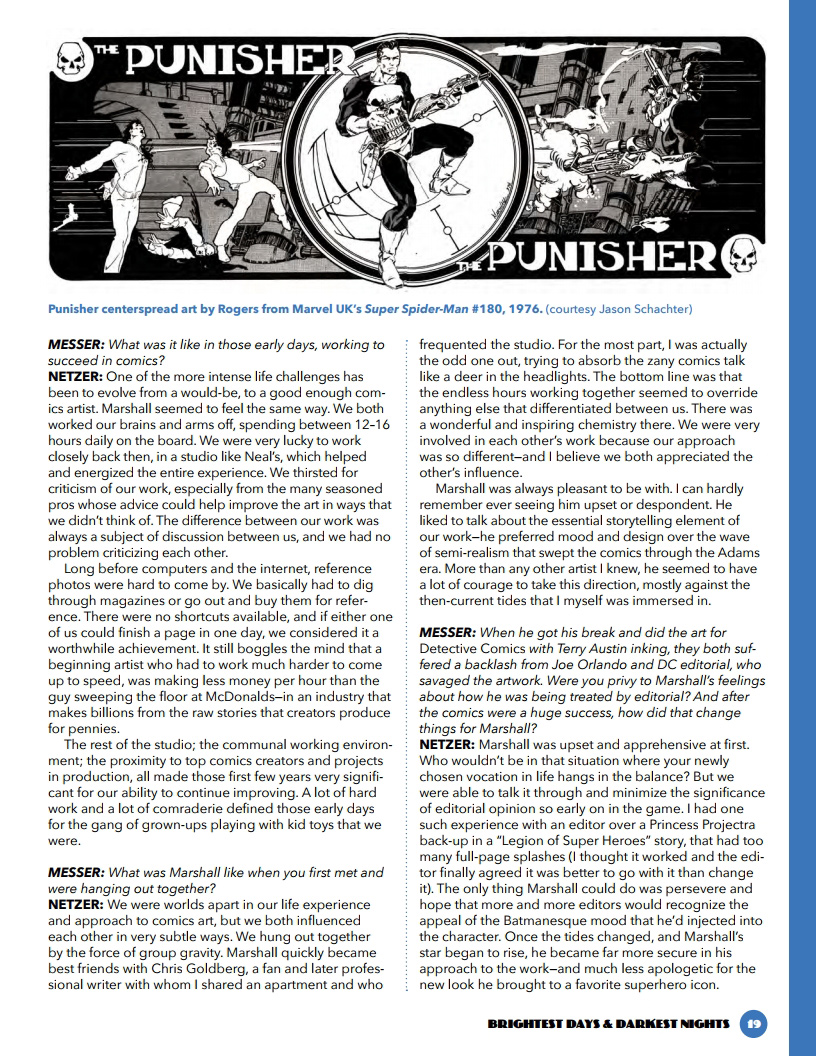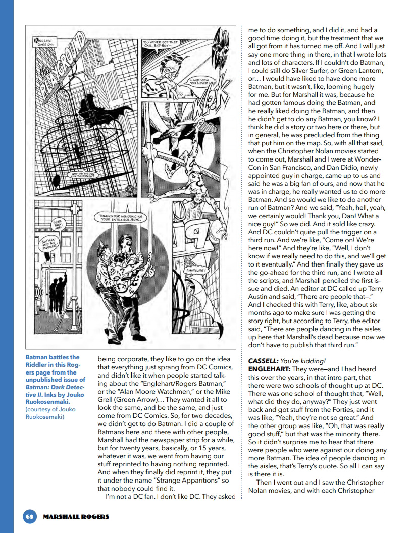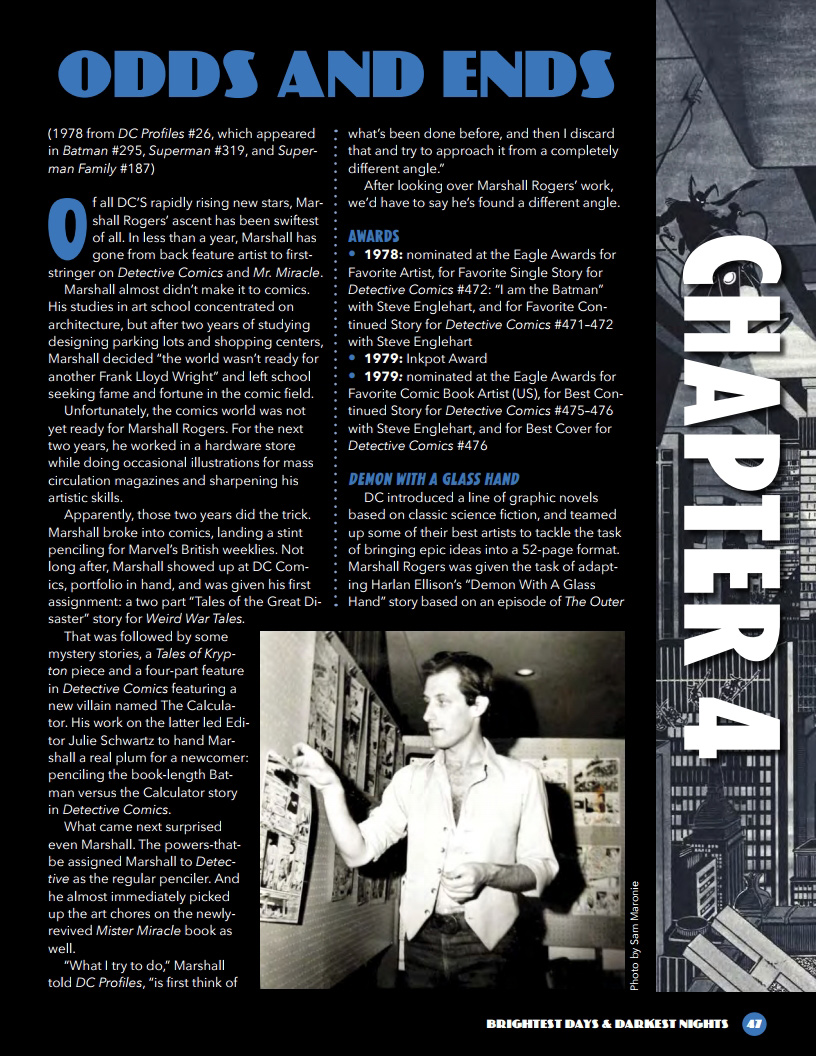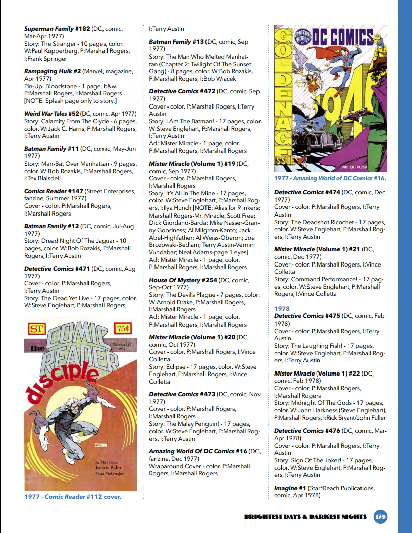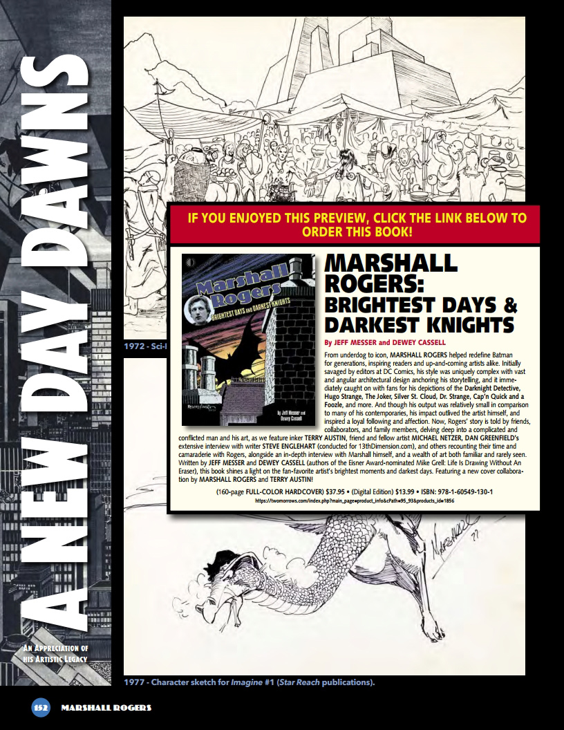 From underdog to icon, Marshall Rogers helped redefine Batman for generations, inspiring readers and up-and-coming artists alike. Initially savaged by editors at DC Comics, his style was uniquely complex with vast and angular architectural design anchoring his storytelling, and it immediately caught on with fans for his depictions of the Darknight Detective, Hugo Strange, The Joker, Silver St. Cloud, Dr. Strange, Cap’n Quick and a Foozle, and more. And though his output was relatively small in comparison to many of his contemporaries, his impact outlived the artist himself, and inspired a loyal following and affection. Now, Rogers’ story is told by friends, collaborators, and family members, delving deep into a complicated and conflicted man and his art, as we feature inker Terry Austin, friend and fellow artist Michael Netzer, Dan Greenfield’s extensive interview with writer Steve Englehart (conducted for 13thDimension.com), and others recounting their time and camaraderie with Rogers, alongside an in-depth interview with Marshall himself, and a wealth of art both familiar and rarely seen. Written by Jeff Messer and Dewey Cassell (authors of the Eisner Award-nominated Mike Grell: Life Is Drawing Without An Eraser), this book shines a light on the fan-favorite artist’s brightest moments and darkest days. Featuring a new cover collaboration by Marshall Rogers and Terry Austin!