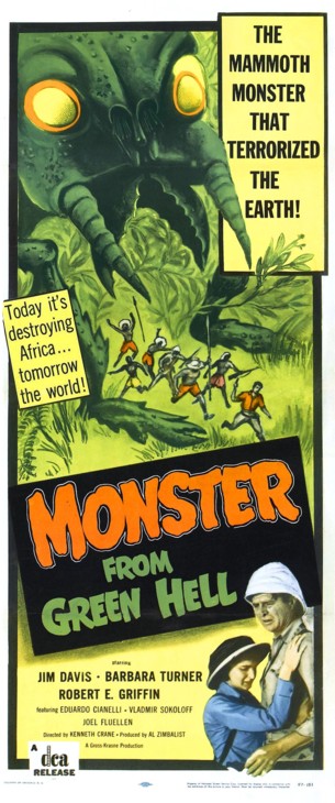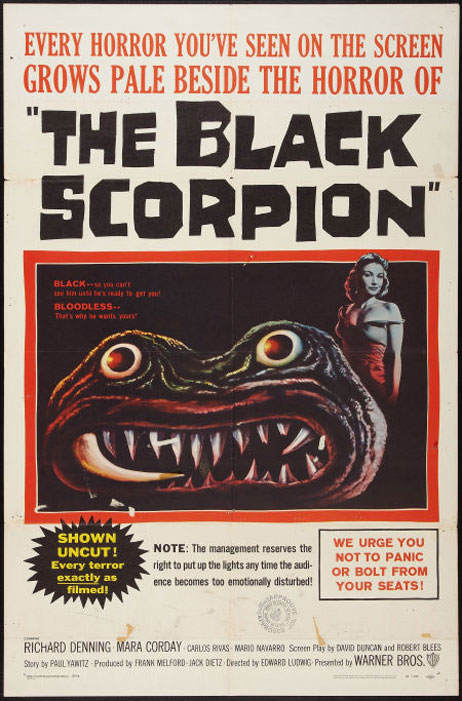 Lots of excellent stop-motion action here. It’s dozens of giant scary scorpions attacking a Mexican town, as the handsome Richard Denning and gorgeous Mara Corday struggle for survival.