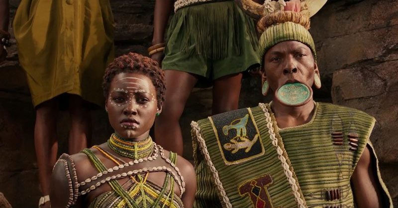 I have remained particularly preoccupied with the juxtaposition of Nakia in her (Lupita Niyong’o) recognized black, natural beauty against that of the elder of the River Tribe who is dressed in the most vivid of greens and has his lip distended with a decorative plate. There has always been an undercurrent of (dare I admit it?) embarrassment at the display of forms of traditional African body mortification like scarification and stretching. Coogler will have none of it. These bodies, their color, their hair, their markings, are to be taken on their own terms and understood to be self-referentially beautiful outside of any need to deal with Western standards of the beautiful.