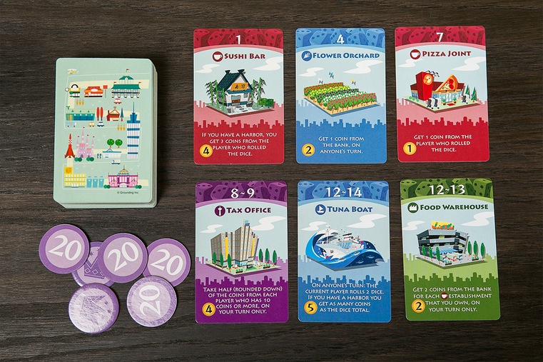 Gameplay is pretty simple with basic games running about a little over half an hour depending on the number of players. You play the mayor of a village trying to build itself up to a successful city. Each turn, a couple of rolls of the dice determine your ability to pick up coins, spend coins on certain buildings and businesses, collect or pay more coins, all while trying to be the first to build landmarks and grow your little village. The expansions add more businesses to build, and more landmarks, thus increasing the game’s difficulty should you wish.