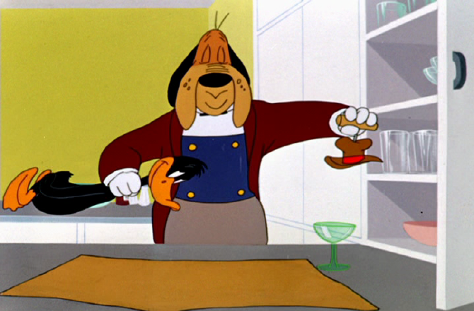 Here he believes he is a comedy genius, despite having no evidence to back that up. The irony is that even though he is portrayed as a flop comic, he comes across as one of the funniest characters to ever grace the animated screen. In one bit, Daffy is tricked into falling into the fountain, but instead of ending the gag with the splash, Daffy yells up at the butler to watch that first step (“it’s a dilly”). He then swims around humming Singin’ in the Bathtub, and remarks to us, “I was a bit dusty…” Daffy here demonstrates that he truly is a master comedian, making a funny situation funnier by finding multiple ways of riffing on it. The ending is also ingenious, nicely capping the film and commenting on the indignities we’re willing to face for a paycheck. And it’s here that Jones’ talent for expressions really shines: Daffy’s face as he is repeatedly smacked with pies couldn’t be more perfect in capturing his attempt to maintain a little dignity while enduring a humiliating situation. And best of all is a truly brilliant monologue where Daffy begins making wild accusations against the butler. The writing is outstanding, and the whole thing is masterfully brought to life by top animator Ken Harris. As Daffy himself points out, what’s Humphrey Bogart got that this guy hasn’t got?