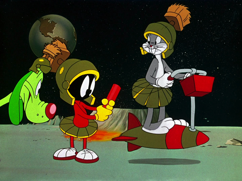 Haredevil Hare marks one of Chuck Jones’ finest Bugs Bunny cartoons, and also a notable one considering it launched the beloved Looney Tunes star Marvin the Martian. Marvin, with his distinctive Roman helmet with a push-broom on top and ridiculous green skirt, was never actually given a name in the five original Warner Bros. cartoons he appeared in (he is referred to as Commander of Flying Saucer X-2 in The Hasty Hare), but was later assigned a name for merchandising purposes.