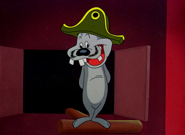 But, as usual, it’s Bugs Bunny who steals the show. The gags are strong enough that this film would be great even with a generic hero, but Bugs’ obvious glee in outsmarting Sam is a large part of the fun. For instance, the sequence with the flaps is already a masterful bit of impossible humor, but the way Bugs taunts Sam into lifting a flap again and again is what really sells it (“Yoo-hoo! Mr. Pi-rate!”). Still, my favorite sequence in the short, and one of the greatest demonstrations of what Bugs Bunny is all about, is the bit where Bugs repeatedly tosses matches into the powder room and Sam dashes off after them. The rabbit’s unflappable coolness as he puts both himself and Sam in mortal danger is classic Bugs: he knows Sam is going to rush after it, so why worry? Few things in this world are funnier to me than Sam attempting to feign levelheadedness as he plays chicken with Bugs (tossing a yo-yo, playing jacks, etc.) Even when it does blow up, it’s Sam’s panic that puts him in direct line of fire to the explosion, and Bugs’ smart-alecky response to the explosion couldn’t be more perfect. He has not even begun to fight, folks!