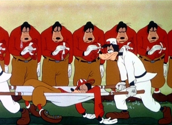 This satirical starting point gives the Disney artists leeway to create the ultimate cartoon statement on football. The short is jam-packed with wonderfully silly visual gags, but what really gives the cartoon its flavor is its fast-paced, anything-for-a-laugh attitude. Every aspect of football is given the razz here; you’ve got gags about the experience of watching the game (the narrator is drowned out by roaring fans and a great play is blocked by hulking spectators), the game’s inherent violence (one of the Goofs is carried away on a stretcher while the narrator insists that football is a character-building sport) and over-the-top team spirit (in one gut-busting scene, three Goofy cheerleaders chant the ungainly title “Taxidermy” while beating the crud out of the middle Goofy). The masculinity of the game is also burlesqued in the coach’s effeminate fawning over his star player.