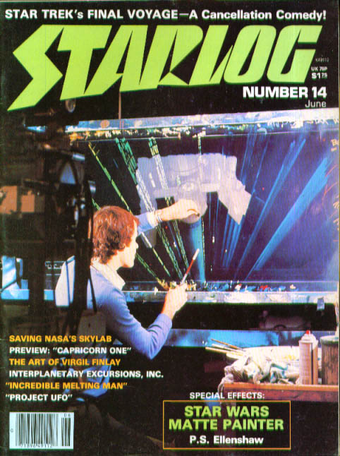 It was Issue 14, with a cover photo of matte artist Peter (later Harrison) Ellenshaw and his Death Star tractor beam painting, which even now, I think, was an unusual choice of cover shot. In retrospect, it wasn’t an especially memorable issue. But, as I was fervently consumed by all things science fiction and special effects-oriented, and especially at that time anything remotely connected to “Star Wars”, I absorbed this (and all future issues) by osmosis. There were pieces on “Capricorn One“; “The Incredible Melting Man” (!), and a tantalizing mention of an upcoming something called “Galactica“. Most remarkably, to me (and something I don’t think “Starlog” had done before, or after), they printed a whole script the first of its kind I’d ever read on the printed page of “Saturday Night Live” writer Michael O’Donoghue‘s Star Trek parody sketch, “The Last Voyage Of The Starship Enterprise“. It was intriguing to me to see dialogue and stage directions in the form in which they were handed to actors.