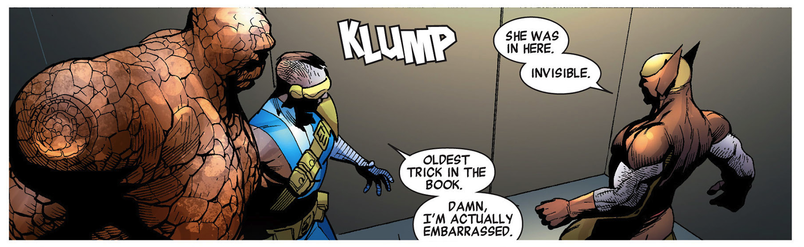Brian Michael Bendis’ Age Of Ultron #8 has Wolverine and Sue Storm being held captive on a Helicarrier by Tony Stark in a parallel universe present, after their Terminator-esque jaunt back in time to kill Hank Pym last time around. There are no Avengers here: they’re The Defenders.