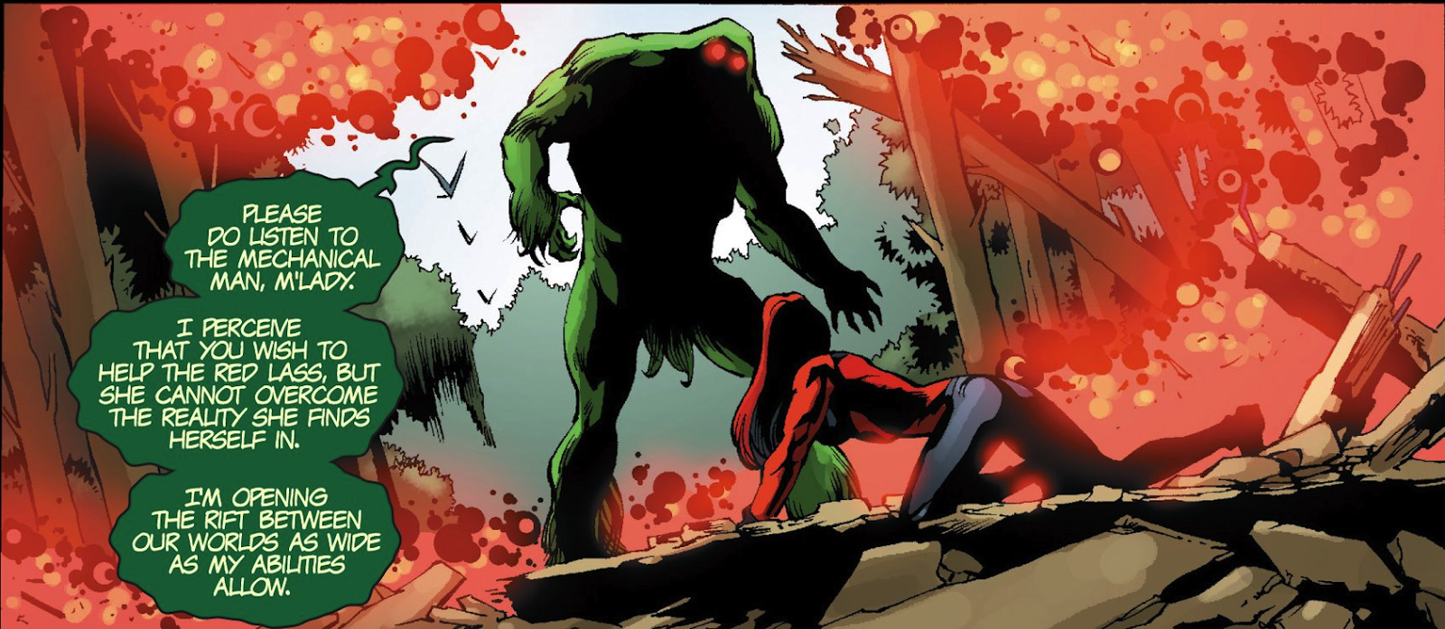 Jeff Parker’s Red She Hulk #66 was an extremely complex issue, and I actually read it through a couple of times, as I was so impressed by it. Betty Ross and Machine Man wander into parallel universes in the Neverglades’ Nexus Of Realities, encountering Man-Thing (who is interestingly portrayed here as articulate, and less the shambling behemoth he often is.)