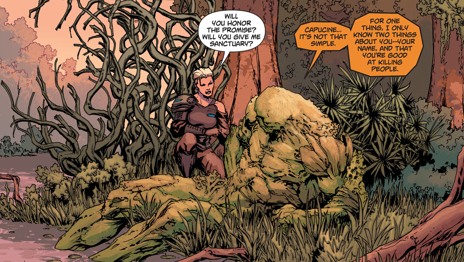 Charles Soule’s Swamp Thing #21 definitely deserves a mention. This is a fairly quiet and interesting little tale. A mysterious woman named Capucine comes to Swampy seeking protection, and using an esoteric entreaty from centuries ago. The same time (what are the odds!), a pair of hunters turn up to kill her, and we discover that her skills are formidable and she’s a thousand years old!