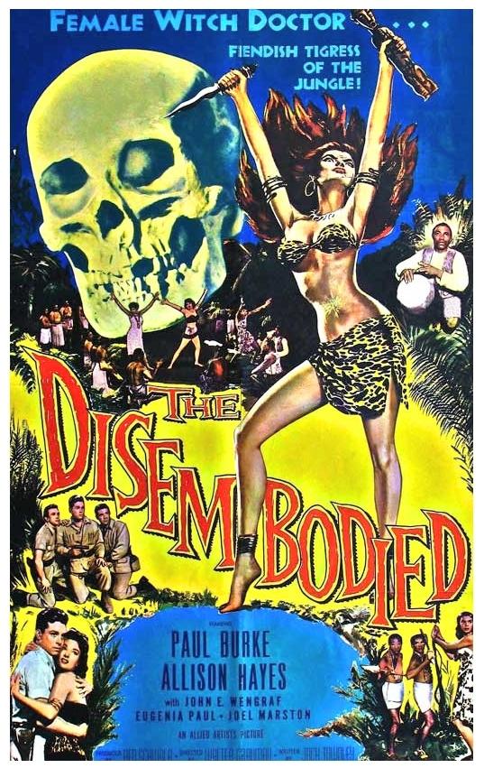 Just before her immortal turn as the ’50 Foot Woman,” voluptuous Allison Hayes played an Indian voodoo priestess living in Africa using voodoo magic to transpose one man’s mind into another man’s body to create a murderous zombie-like slave. Got that?