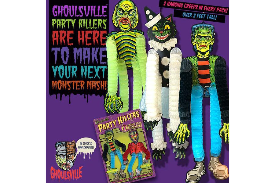 Introducing NEW Ghoulsville 3-D Party Killers! These to-die-for, custom made novelty decorations, are inspired by something very old- the honeycomb “dancing” tissue decorations reminiscent of Halloween party decor from the 30’s-60’s. We thought the old idea was ready for a fresh Retro-a-go-go! upgrade. This collection features our lurid and much-loved Ghoulsville Monsters!