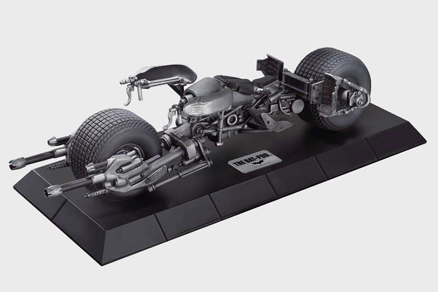 In The Dark Knight, Batman chased the Joker through the streets of Gotham on his high-performance motorcycle, the Batpod. Now, the Noble Collection has released an authentic miniature replica. This miniature die-cast Bat-Pod has complex detailing and intricate moving parts. It measures 11 inches long, features metal sections and rubber wheels, and can be removed from the striking display stand.