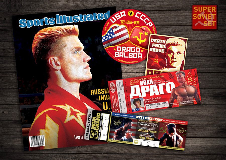 Soviet Super Set Includes: Ivan Drago Replica Sports Illustrated Magazine Cover, MGM GRAND Replica Ticket to the Creed Vs. Drago Fight in Vegas, USSR Replica Ticket to the Balboa v Drago Fight in Russia, 4″ Commemorative Rocky v Drago Super Sticker, and 3.5″ Death From Above Drago “hype” sticker!