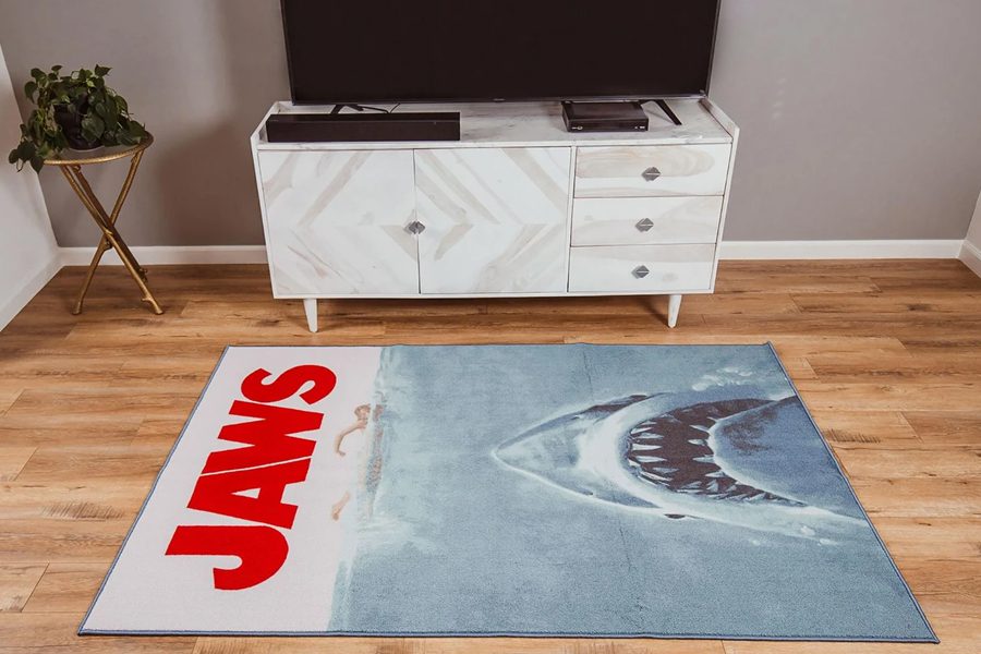 Inspired by the classic thriller film comes this accent rug woven with the design from Roger Kastel’s iconic art which was used both for the cover of the Peter Benchley book and the Steven Spielberg film. This themed accent rug features a polyester pile with a blue edge binding the color of the water.