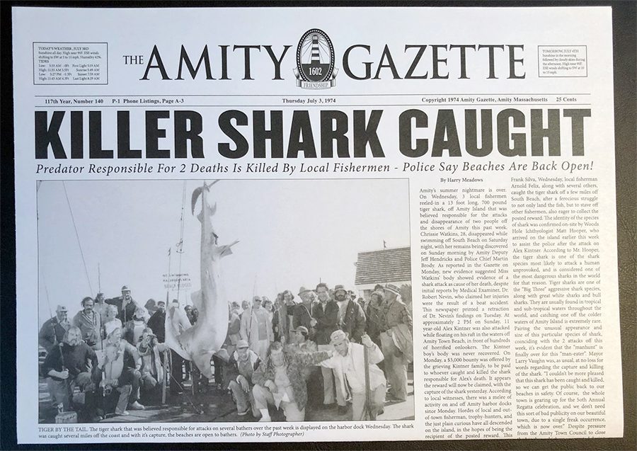 This amazing fan reproduction of The Amity Gazette as seen in the classic film Jaws after locals caught a tiger shark, thinking it was the great white shark that killed Alex Kintner and Chrissie Watkins.