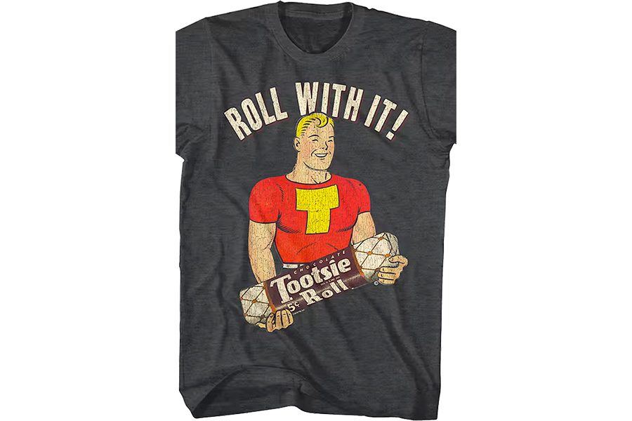 This Roll With It! Tootsie Roll T-Shirt shows Captain Tootsie, the superhero who was created to promote Tootsie Rolls. He’s shown here with a “T” emblem on his shirt and holding a huge Tootsie Roll. The Captain had a sidekick named Rollo and they created the Secret Legion along with Fatso and Fisty. He first appeared in 1943 and gained strength and energy by popping Tootsie Rolls. Created by C.C. Beck and Pete Costanza (Beck was the co-creator of the character Captain Marvel, who is known today as Shazam), Captain Tootsie appeared not only in ads, but also in Fawcett Comics, where the character appeared in hundreds of adventures.