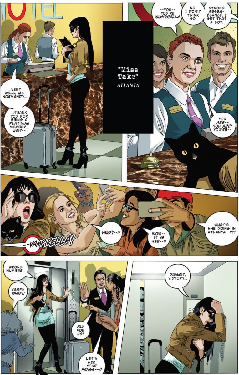 That child, Katie, has tracked Vampirella down to Atlanta largely thanks to Vampirella having been outed on social media by her now-ex gal pal Victory. Now obsessed with her idol Vampirella, Katie is not taking “no” for an answer, and an overwhelmed Vampirella reflects on the root cause of it all— Mom.