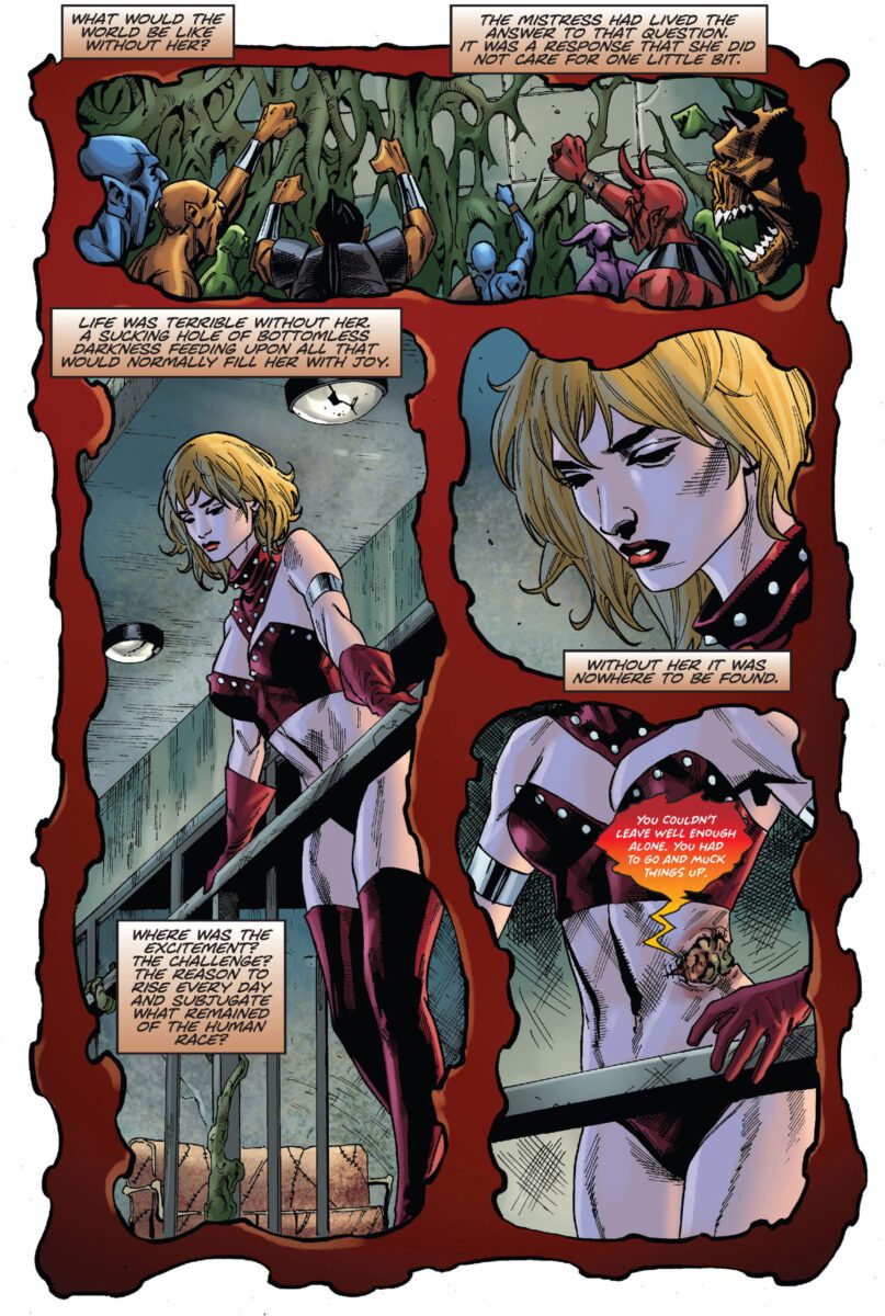 Mistress Nyx has been injured by Vampirella during a battle, a gaping wound torn in her side. This wound has become infected, and is making our Mistress of Chaos incredibly ill. As her loyal servants, Desmond and Harmony Discord, attempt to heal her, Nyx is experiencing some pretty wild fever dreams.