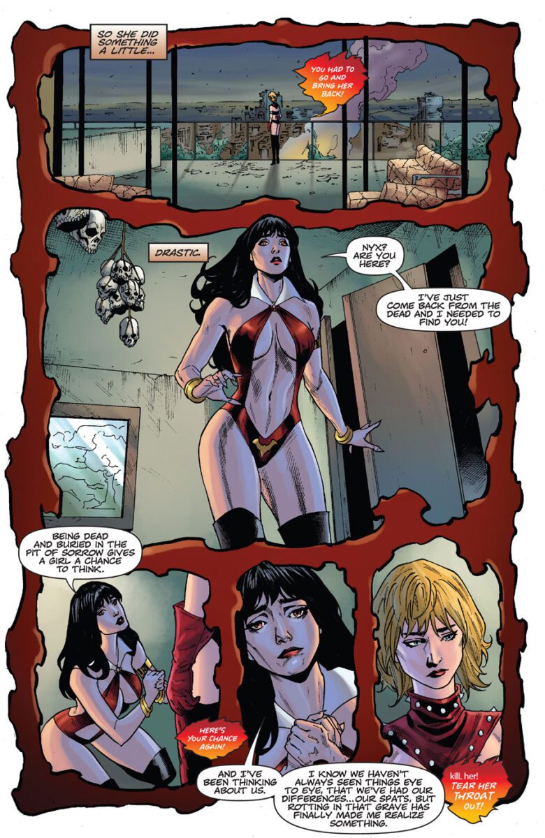 Panel 5. We hear Nyx’s words about why she’s brought Adam back. She wants to destroy what remains of Vampirella’s soul.