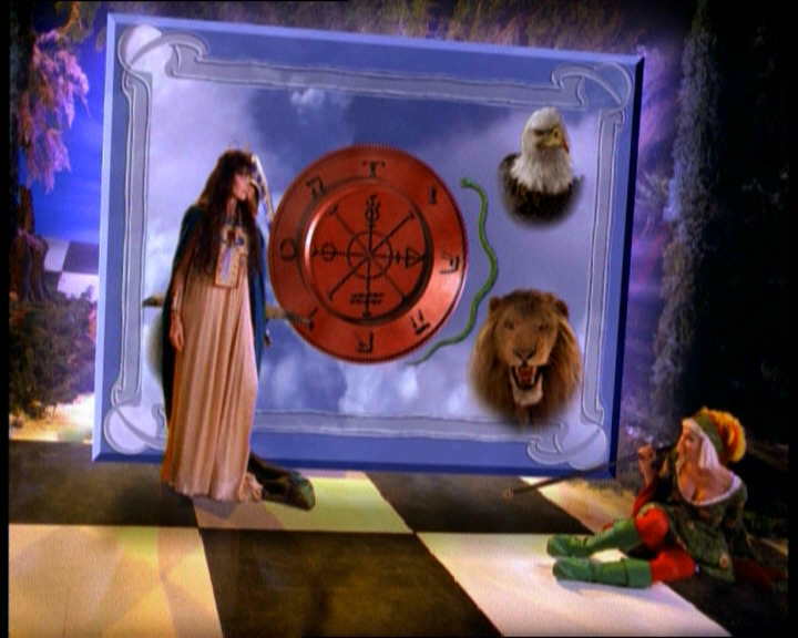 What happens next seems like such a big trip, with talking…um singing, animals and such. Callisto is the guide here in Illusia and tells Xena she has to spin the wheel. (I hope she gets the coal miner’s glove!) Gabrielle then comes down the water just like Xena did…naked. Joxer is then jamming and singing and eventually turns grass into a dress and Gabrielle gets un-naked. Back to Xena and Callisto. They go outside of the castle and a bunch of soldiers start singing, welcoming Xena home to her evil roots.